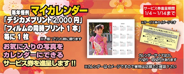 お気に入りの写真をカレンダーにできるサービス券を進呈いたします