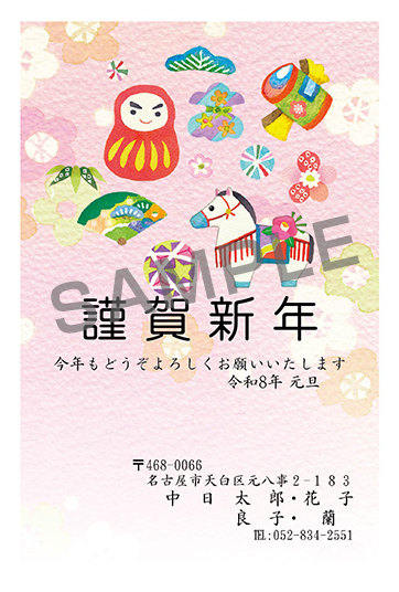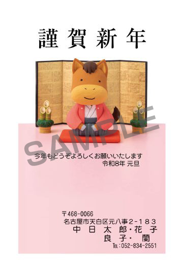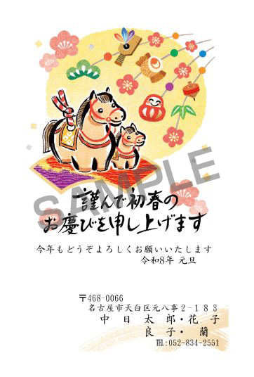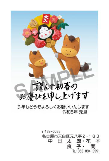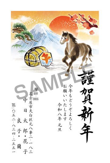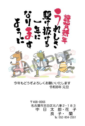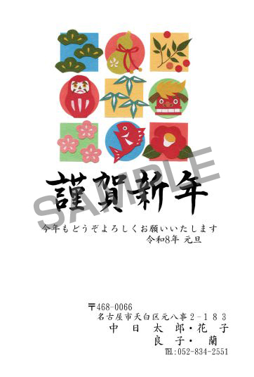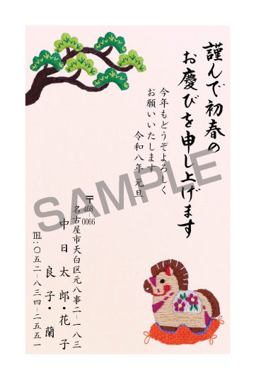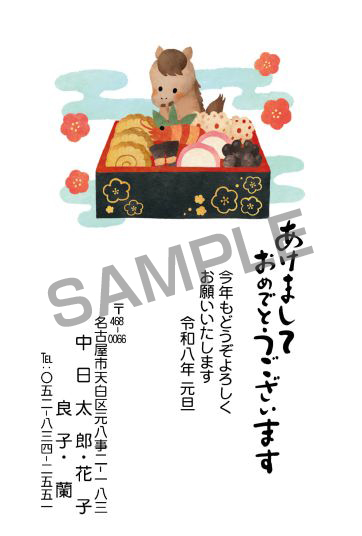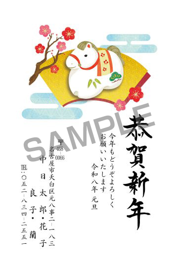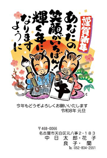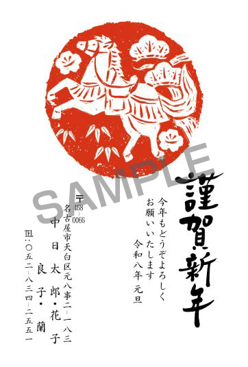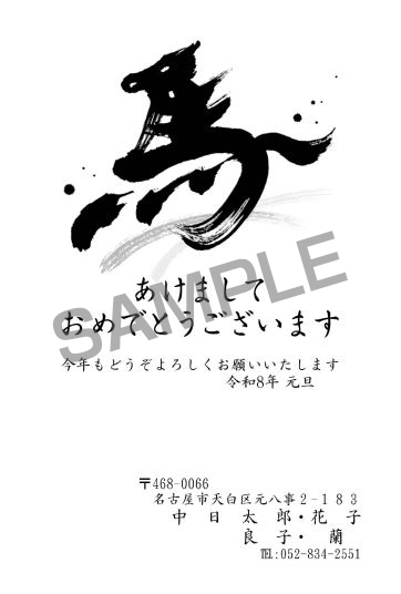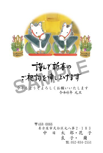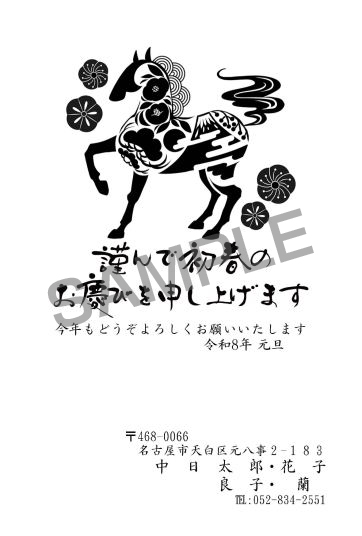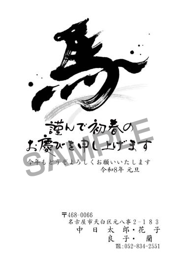 ・白黒の印刷です ・差出人・氏名・住所・お電話番号 e-mailなどが入ります。 ・あいさつ文は固定となり選べません。 ・はがき代別途かかります。 ・5枚以上からご注文になります ・店頭受付の方は年賀ハガキ持込OK ・ハガキ直接印刷タイプ |