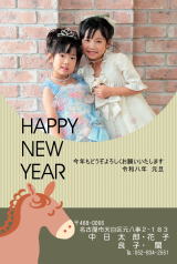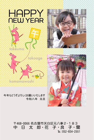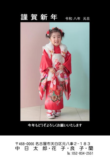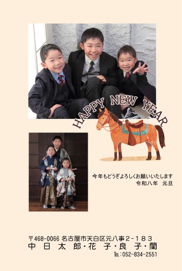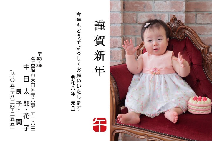 ・写真の入る、定番年賀状、 ・差出人・氏名・住所・お電話番号 e-mailなどが入ります。 ・あいさつ文が選べます。 ・はがき代別途かかります。 ・5枚以上端数OK ・店頭受付の方は年賀ハガキ持込OK ・直接印刷・貼り合わせタイプ選べます |