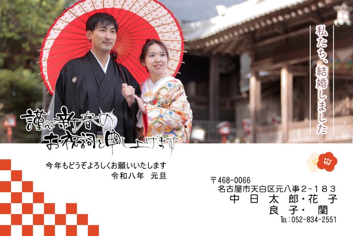 | ⑬ | 私たちは昨年〇月〇日に結婚しました まだまだ未熟な二人ですが 本年もどうぞよろしくお願いいたします 令和8年元旦 |